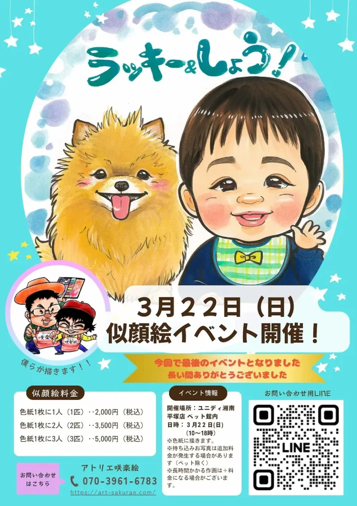 3月22日、日曜日にユニディ湘南平塚店様のペット館で似顔絵コーナー開催します☺️突然ではございますが、3月22日がユニディ様での最終出店日となります。ご愛顧頂いた皆様、スタッフ様、関係者の皆様にはとても感謝しております。 今後の活動... -